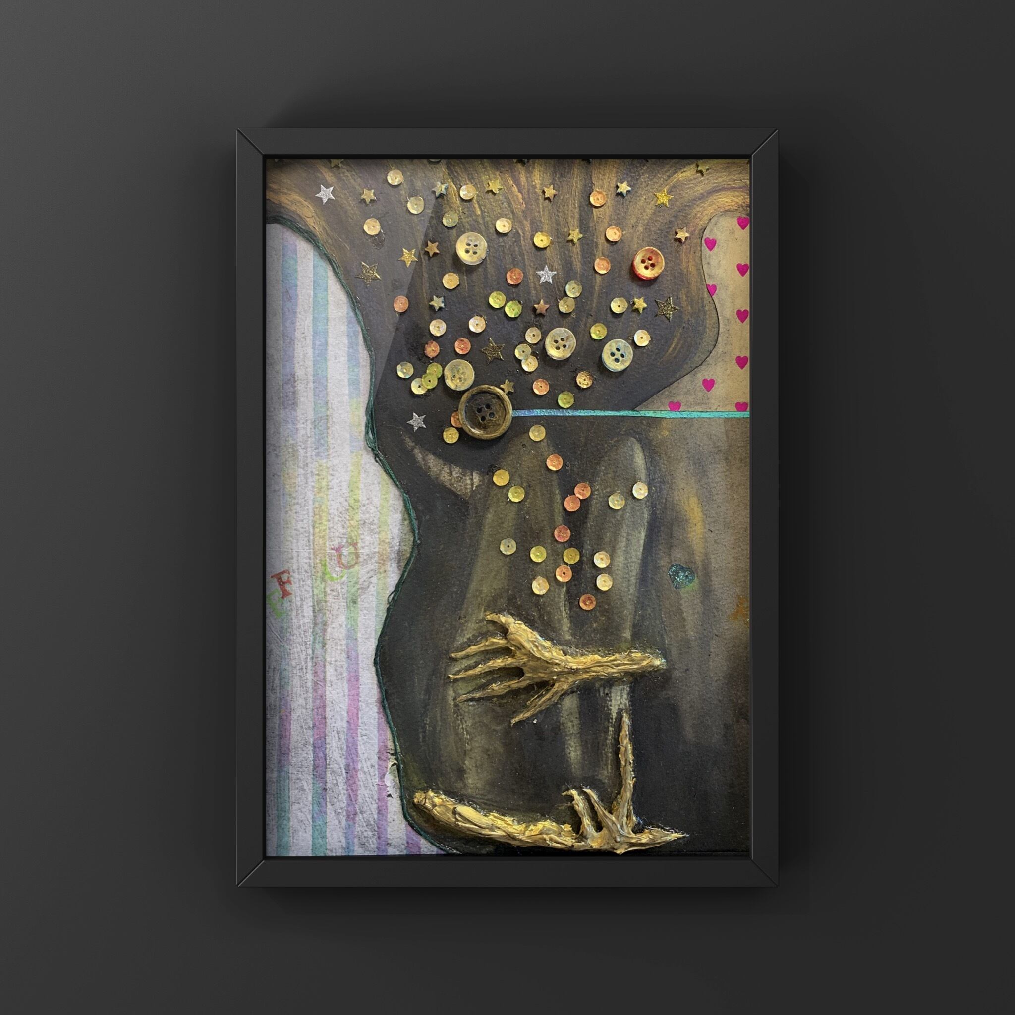 Japanese paper, acrylic paint, watercolor paint, mineral pigment, gold foil, charcoal, pencil, three-dimensional collage