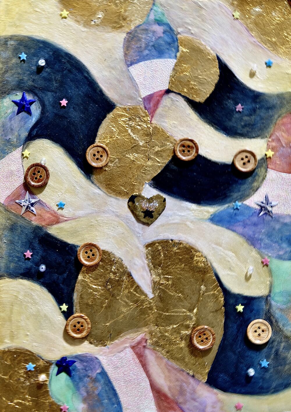 Wooden panel, Japanese paper, acrylic paint, watercolor paint, mineral pigment, gold foil, charcoal, pencil, three-dimensional collage