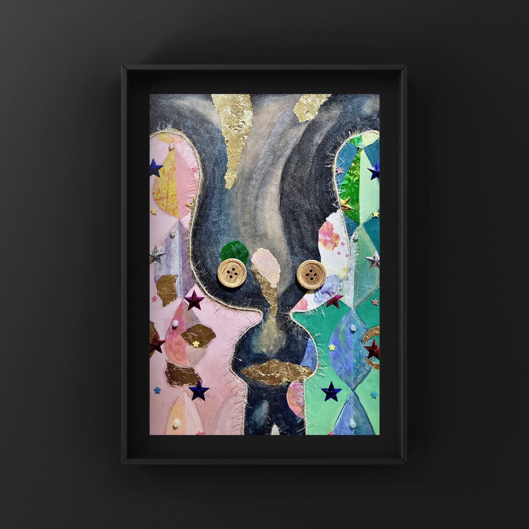 Wooden panel, Japanese paper, acrylic paint, watercolor paint, mineral pigment, gold foil, charcoal, pencil, three-dimensional collage
