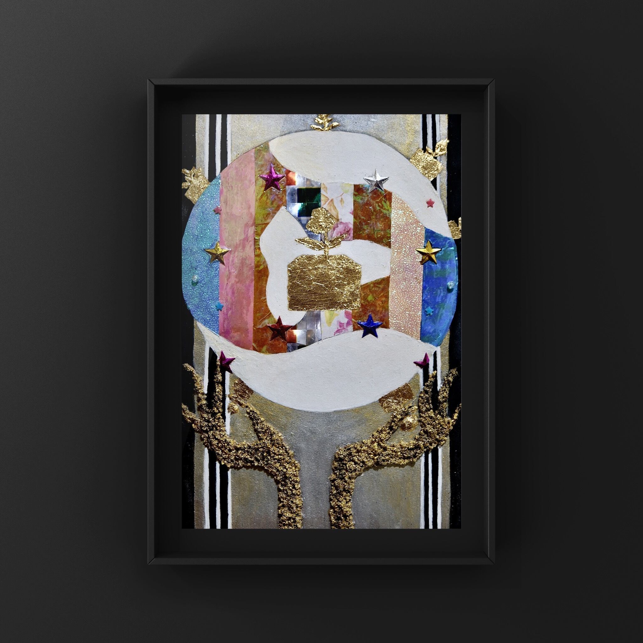 木製パネル、和紙、アクリル絵具、水彩絵具、岩絵具、金箔、木炭、鉛筆、立体コラージュ