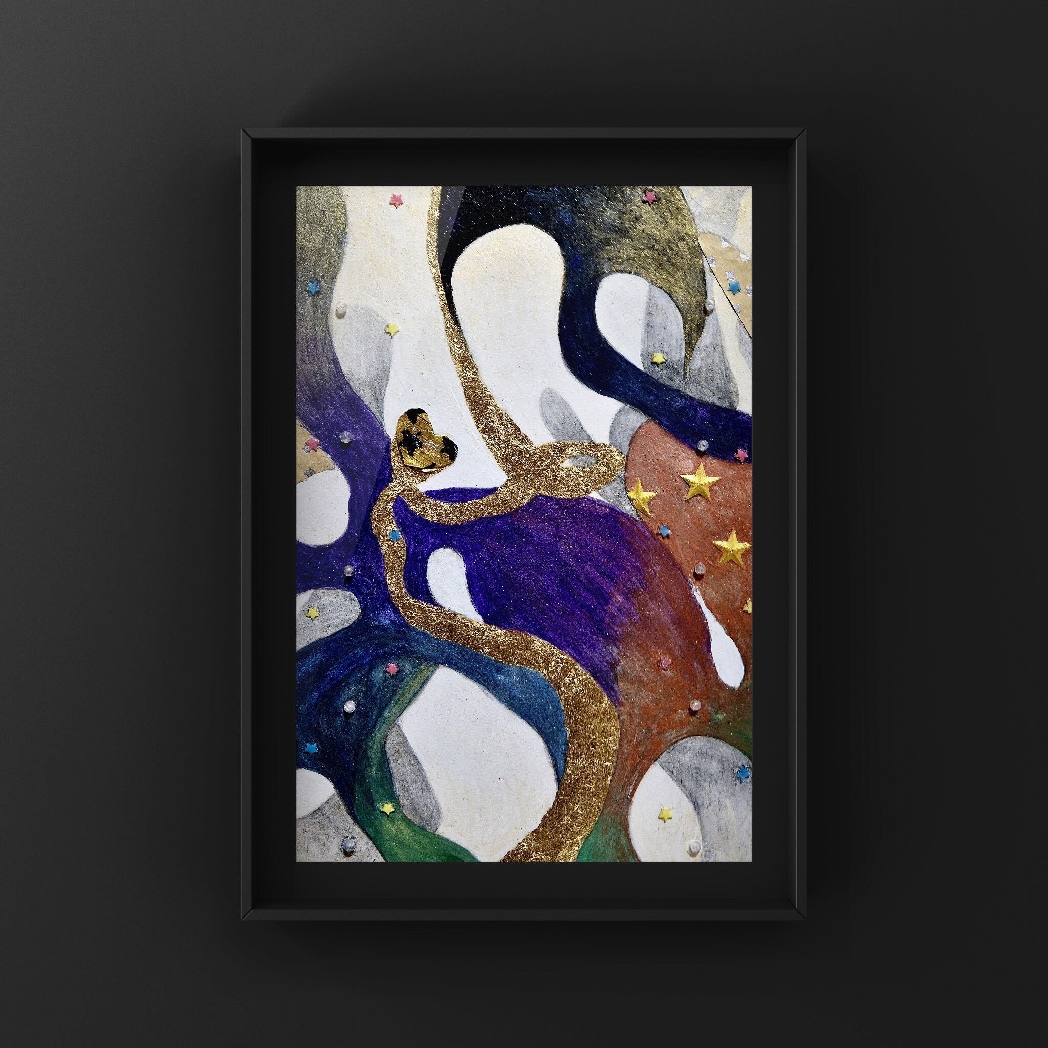 木製パネル、和紙、アクリル絵具、水彩絵具、岩絵具、金箔、木炭、鉛筆、立体コラージュ