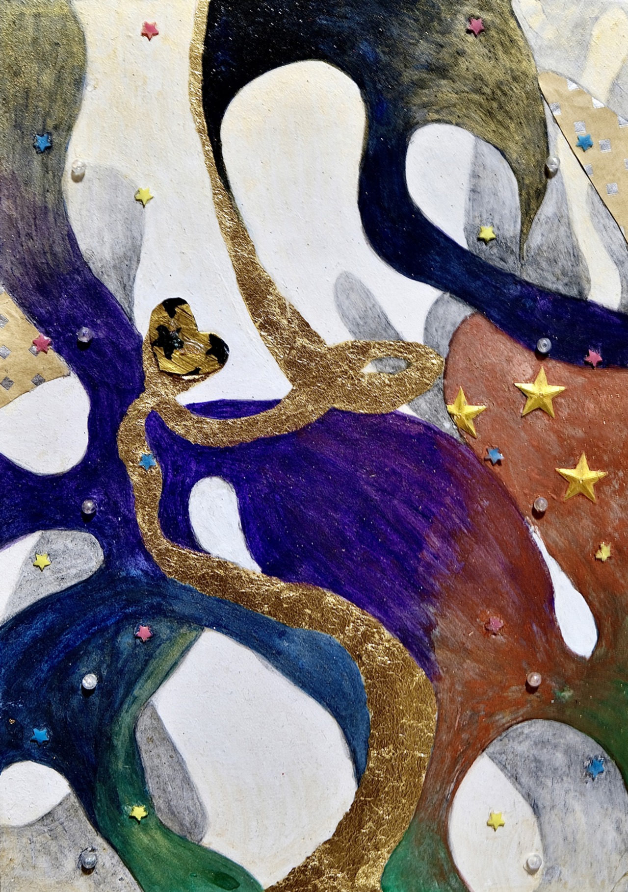 Wooden panel, Japanese paper, acrylic paint, watercolor paint, mineral pigment, gold foil, charcoal, pencil, three-dimensional collage